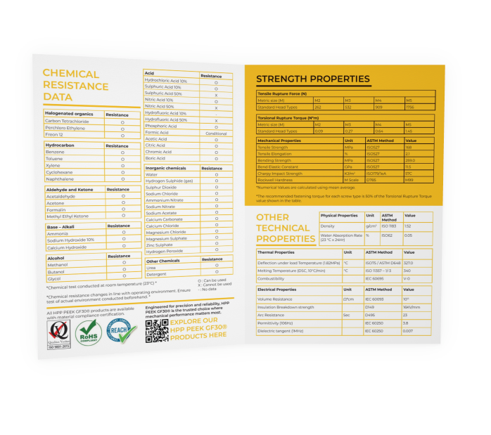 High-quality A4 datasheet that presents the key performance characteristics of PEEK GF30 in a clear, professional format. Printed on 250 gsm gloss paper for durability and a premium feel, it includes comprehensive technical data covering mechanical, thermal, electrical, and chemical properties.
